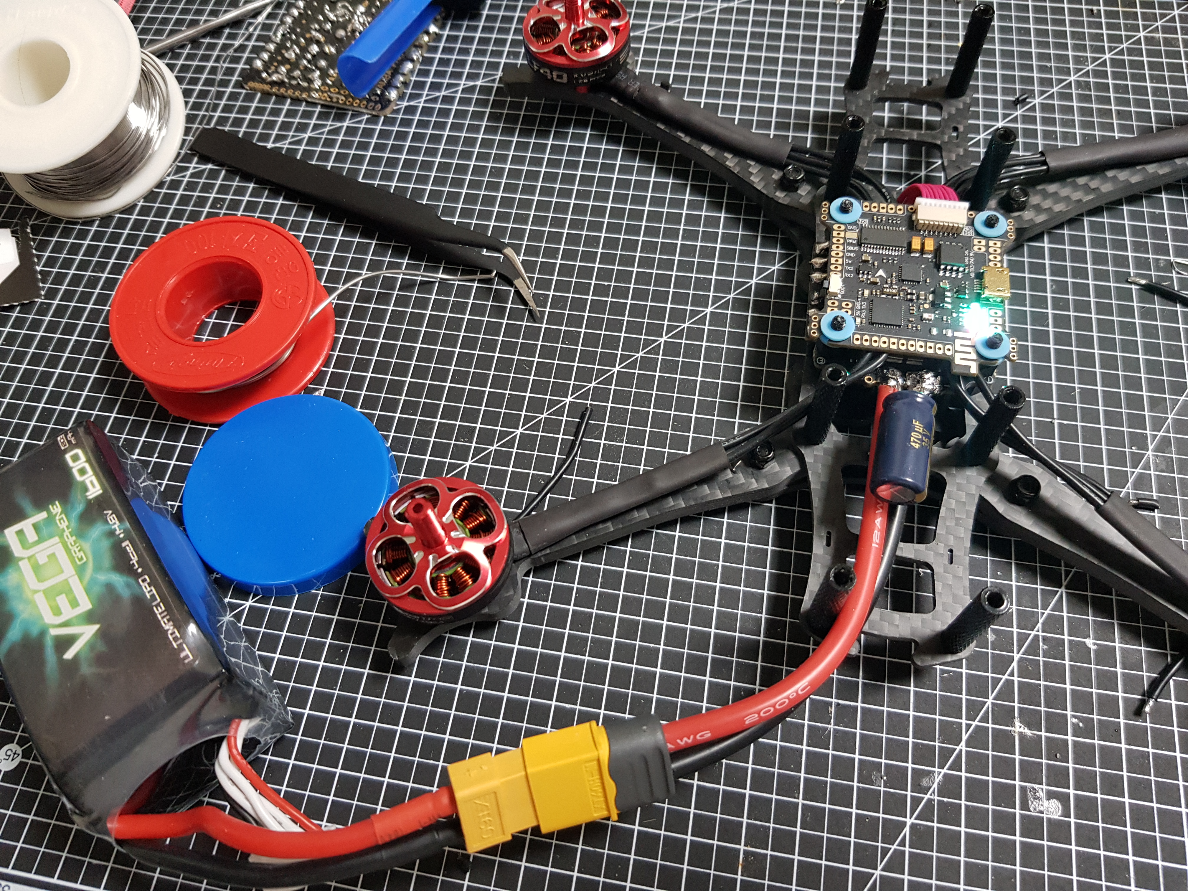 프레임 윗판을 조립하고, 프로펠러를 체결하고, 배터리를 얹어 완성된 모습입니다. 아직 직구로 주문한 액션켐이 오지 않아서 나중에 테스트를 할까 하다가 바로 날려 봤습니다.