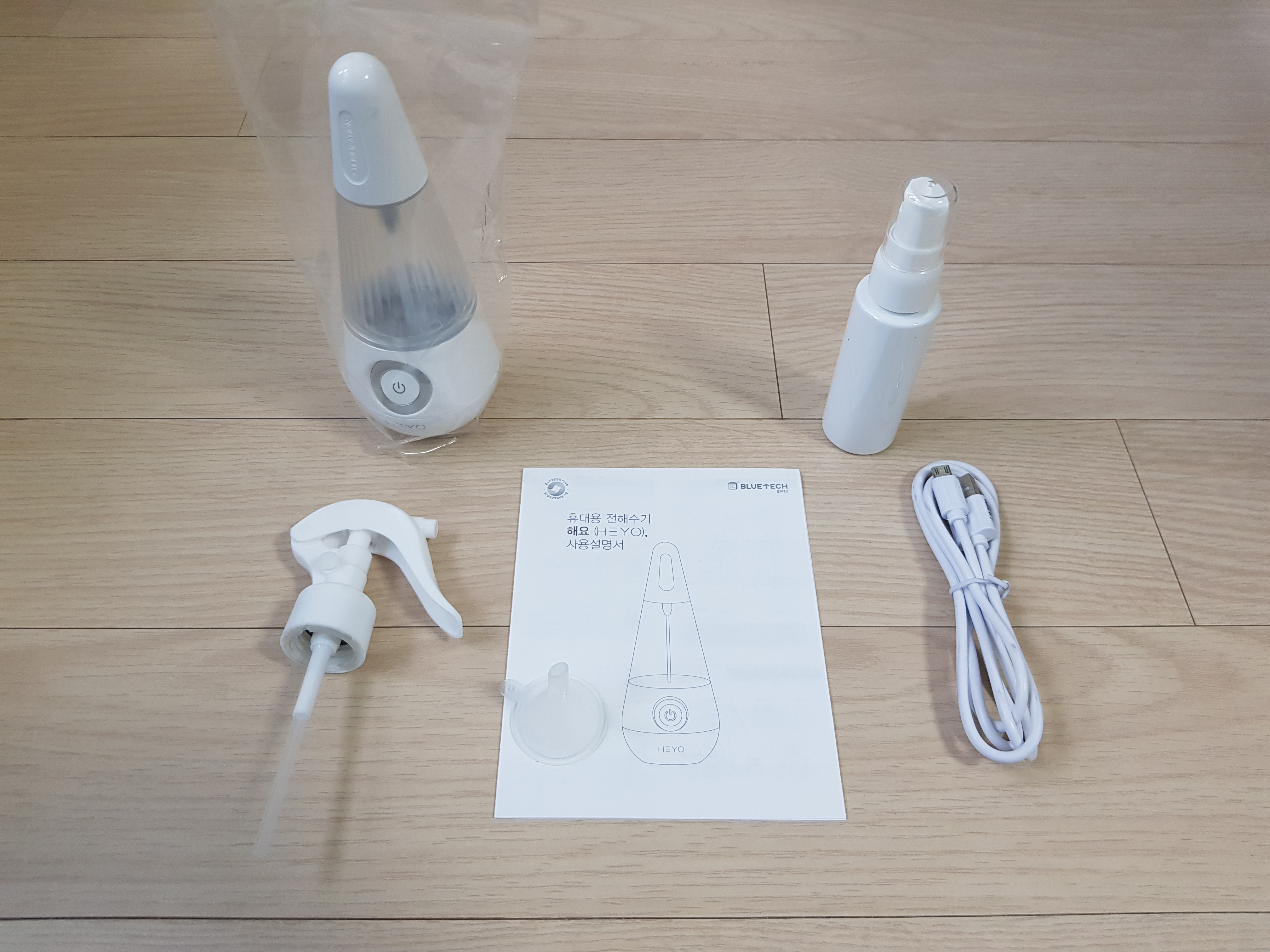 구성품들의 모습. 본체와 전원 케이블, 설명서, 스프레이 레버, 깔대기, 휴대용 용기가 들어있습니다.