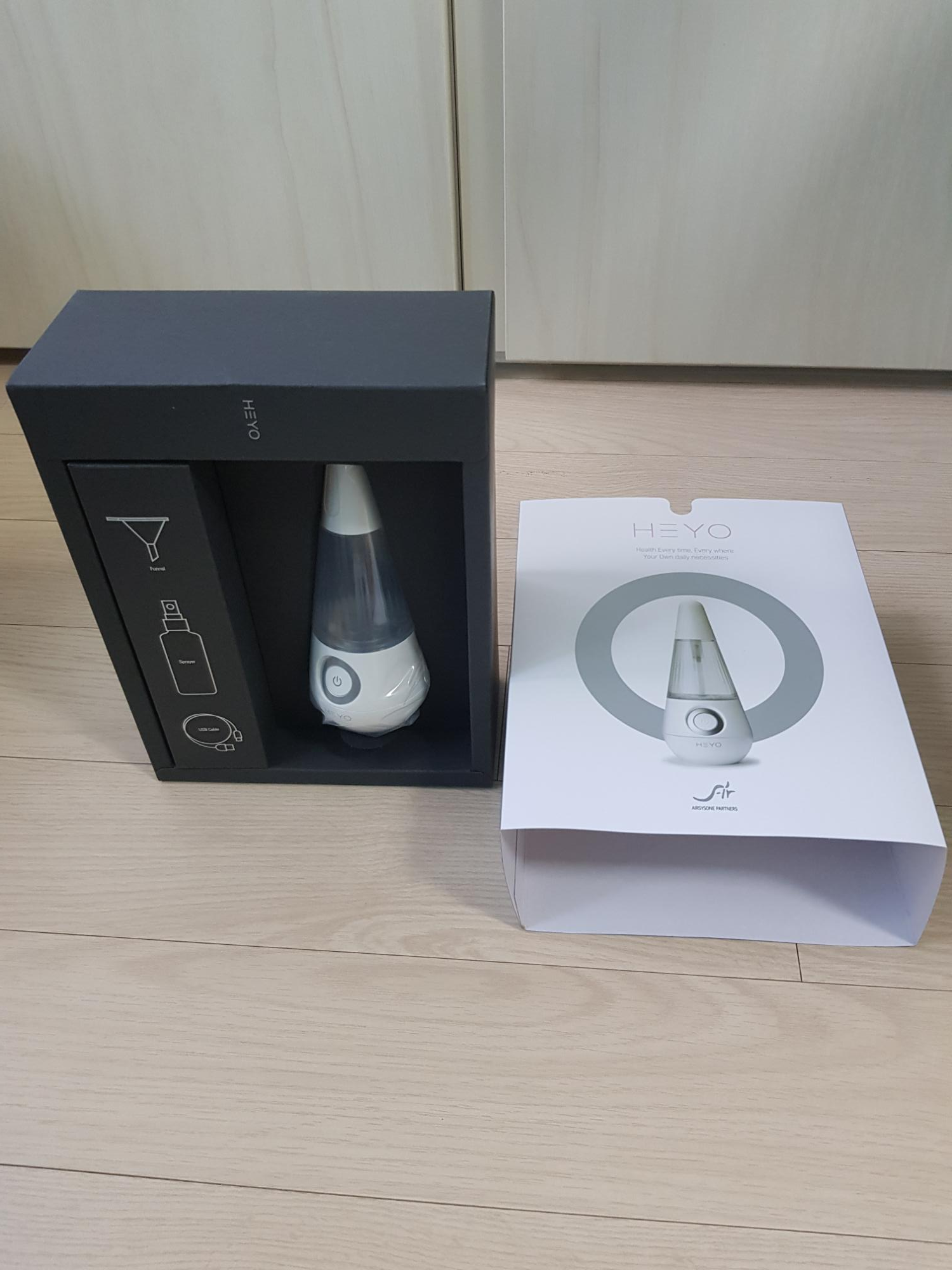 개봉 전 박스의 모습입니다. Heyo는 (주)블루테크에서 생산해서 (주)에어시스원파트너스를 통해 판매되는 국내 중소기업의 제품으로서, 생산물 책임보험 1억 원 가입되어 있기에 더욱 안심하고 사용하실 수 있는 제픔이라고 생각합니다.