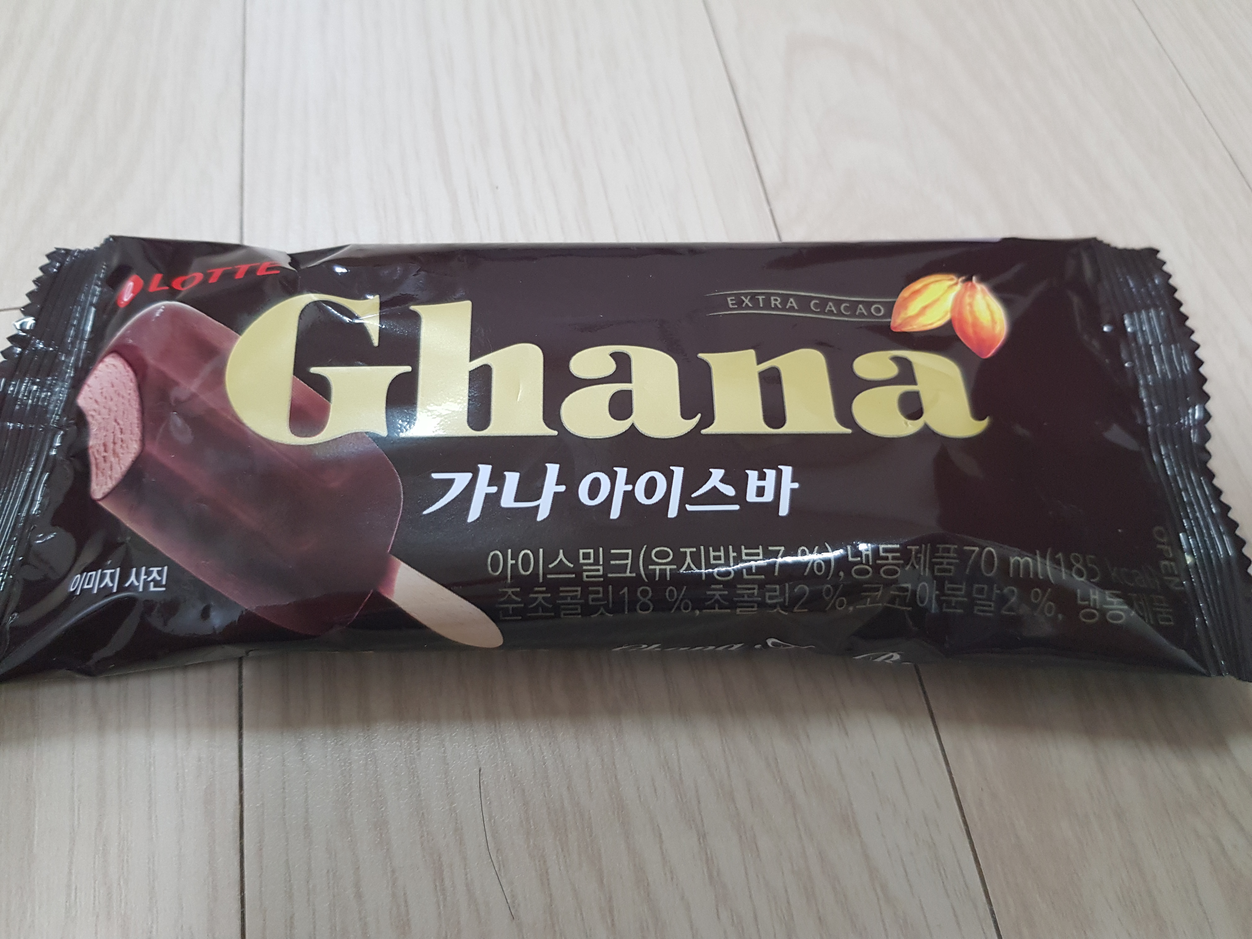 겉은 얇고 살짝 딱딱한 초코 껍데기로 쌓여 있으며, 안쪽에는 정말 쫀득하고 진한 초코맛 아이스크림이 있습니다. 쌍쌍바 초코와는 차원이 다른 진한 초코맛이라고 생각합니다. 가나(Ghana)라는 이름으로 오랬동안 초콜릿을 만들어온 회사답게 그에 걸맞은 초코 아이스바를 만들었다는 생각입니다.