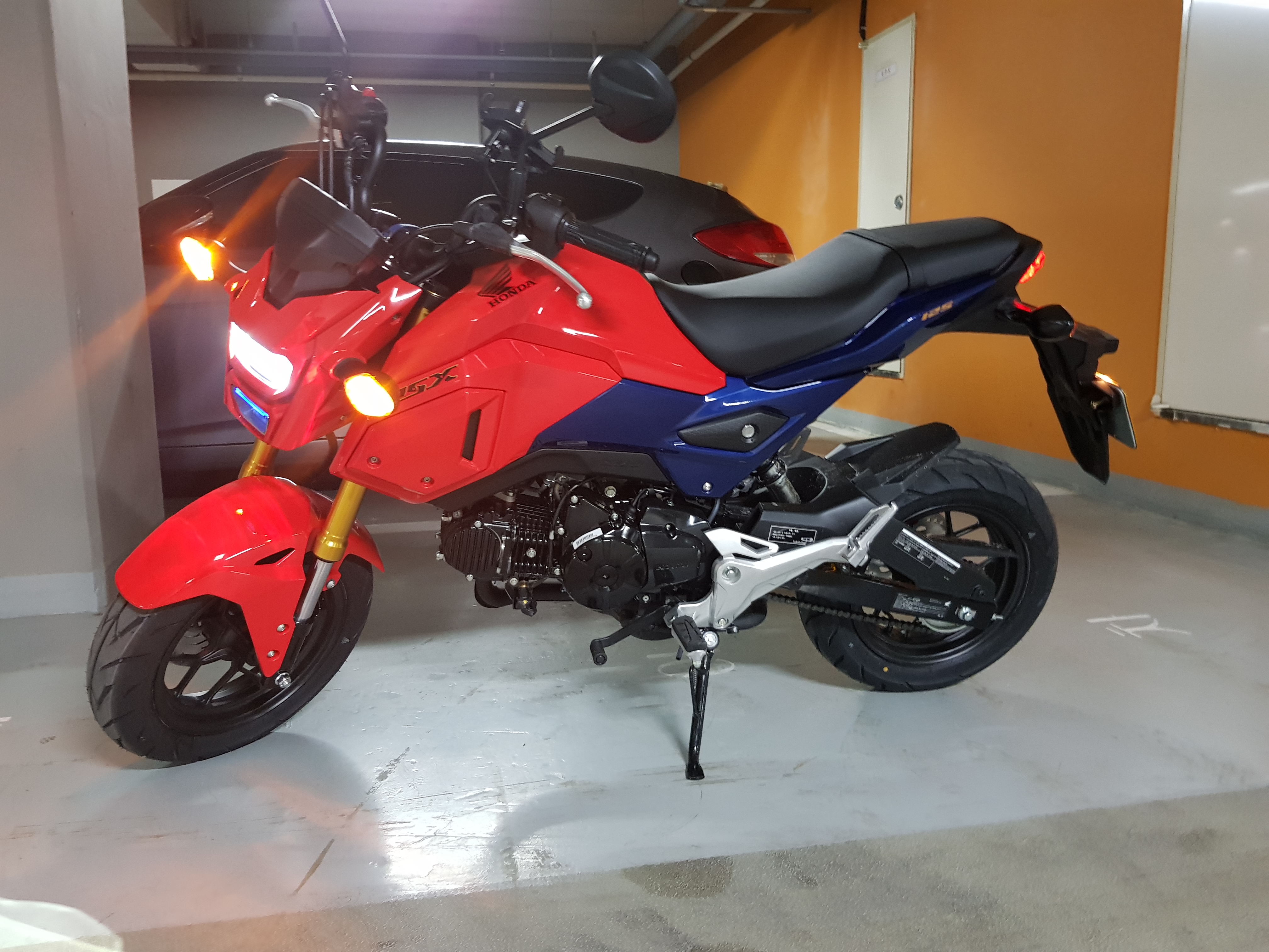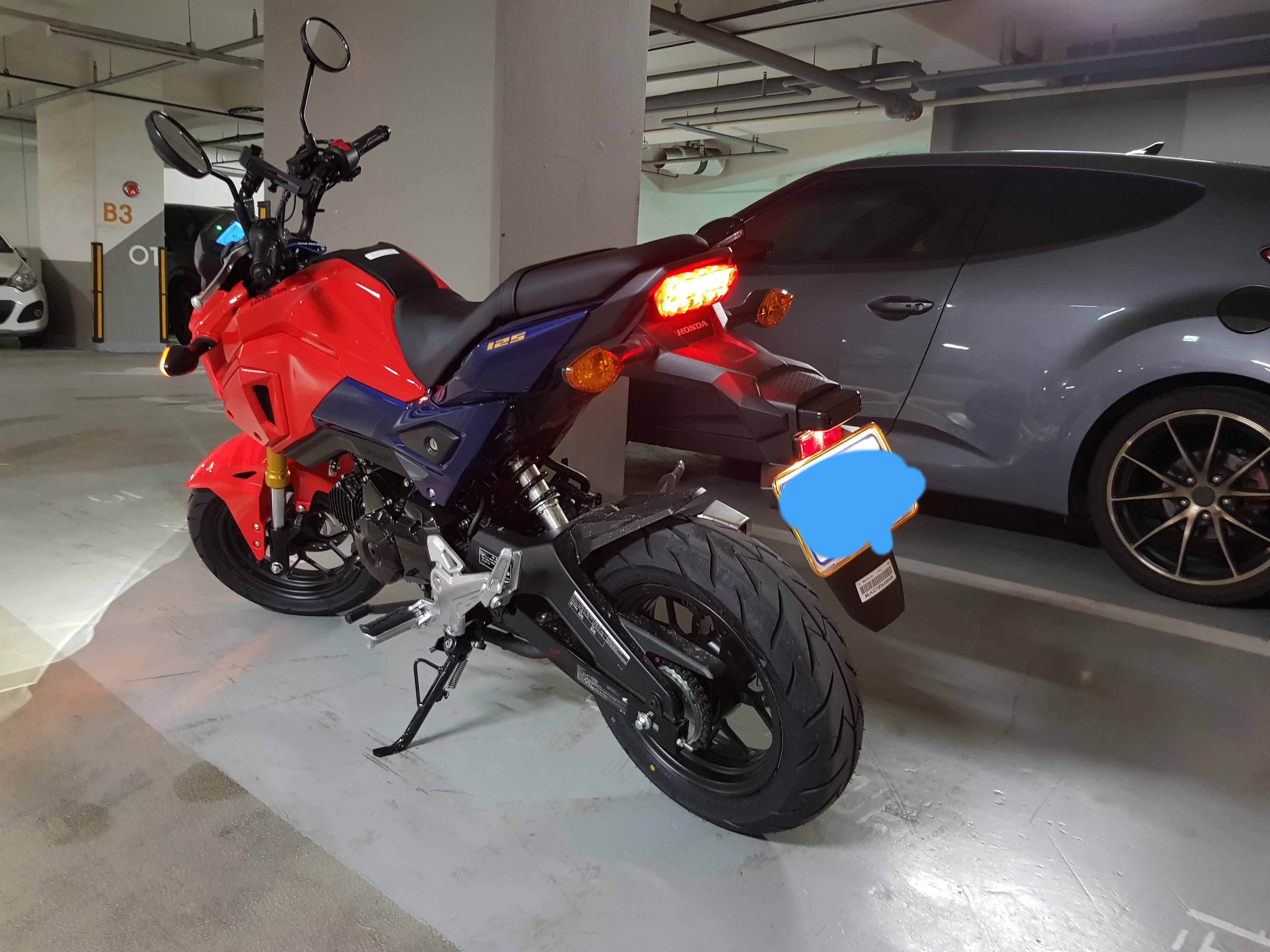 바이크는 한 번도 안타봤지만 자동차 수동 골수매니아라 클러치 감이나 기어 변속에는 자신이 있었다. 그러나 내가 가장 걱정했던 부분 중 하나가 바이크의 무게. 그래서 가볍고 시트고가 낮아 입문자용으로 많이 탄다는 혼다의 MSX125를 신차로 구입하게 됐었다. 흔히들 박스 깐다고 하더라 ㅎㅎ 실제로 본 이놈은 생각보다 작지 않았고 너무 예쁜 디자인에 칼라까지 완전 내 스타일이었다.